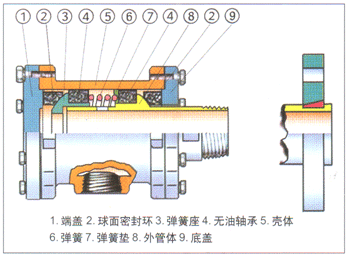 其结构简单、密封性能稳定、维护方便,是同类产品中应用最广泛的一种。其结构如图所示:外管体直接接到辊子或烘筒上,为主要的旋转部件;经过精加工的外管体球面、底盖底平面和侵渍石墨球面密封环共同组成密封可靠的动密封摩擦副;球面密封环在其壳体内的环形空间中滑动,加之无油轴承与壳体的紧密配合,使旋转接头自由支撑,故对装机精度要求不高;球面密封环磨损后借助于弹簧的预压力随时得到补偿,补偿时壳体缓缓向后移动,并可通过外管体的刻线观察到密封件的磨损程度;当蒸汽、水或其他介质流经球面密封环和无油轴承时,形成一层很薄的液膜,提供密封和润滑,从而减轻了摩擦和磨损,延长了使用寿命。另外,壳体上采用双支耳支承,使大规模旋转接头支承更平稳,密封更稳定。