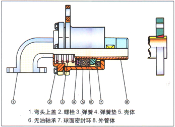 采用球面密封,无油轴承支承定位,密封环磨损后借助于弹簧的预压力随时补偿,补偿时壳体沿轴向缓缓向后移动,故对装机精度要求不高。当蒸汽、水或其他介质流经球面密封环和无油轴承时,形成一层很薄的液膜,提供密封和润滑,从而减轻了摩擦和磨损,延长了使用寿命。